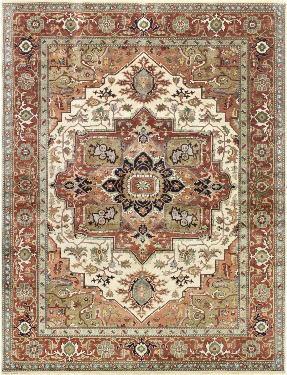 11’11” x 8’10” Heriz 101 – 122975 Rug#:122975Size:8’10” x 11’11”Design: HerizDesign#:101Color: Ivory / RustContent:100% Wool PileOrigin: IndiaSize Category:9×12 category Traditional Collection date November 3, 2022
