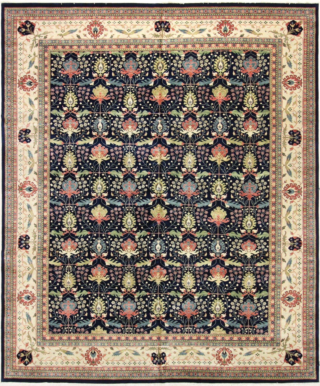 12’1” x 14’9” Indo Oushak 3025 – 108799 Rug#:108799Size:12’1” x 14’9”Design: OushakDesign#:3025Field Color:NavyBorder Color:IvoryContent:100% Wool PileOrigin: IndiaSize Category:12×15 – 12 x 15 Rugs category Traditional Collection tag 12x15 oversized rugs date June 27, 2024