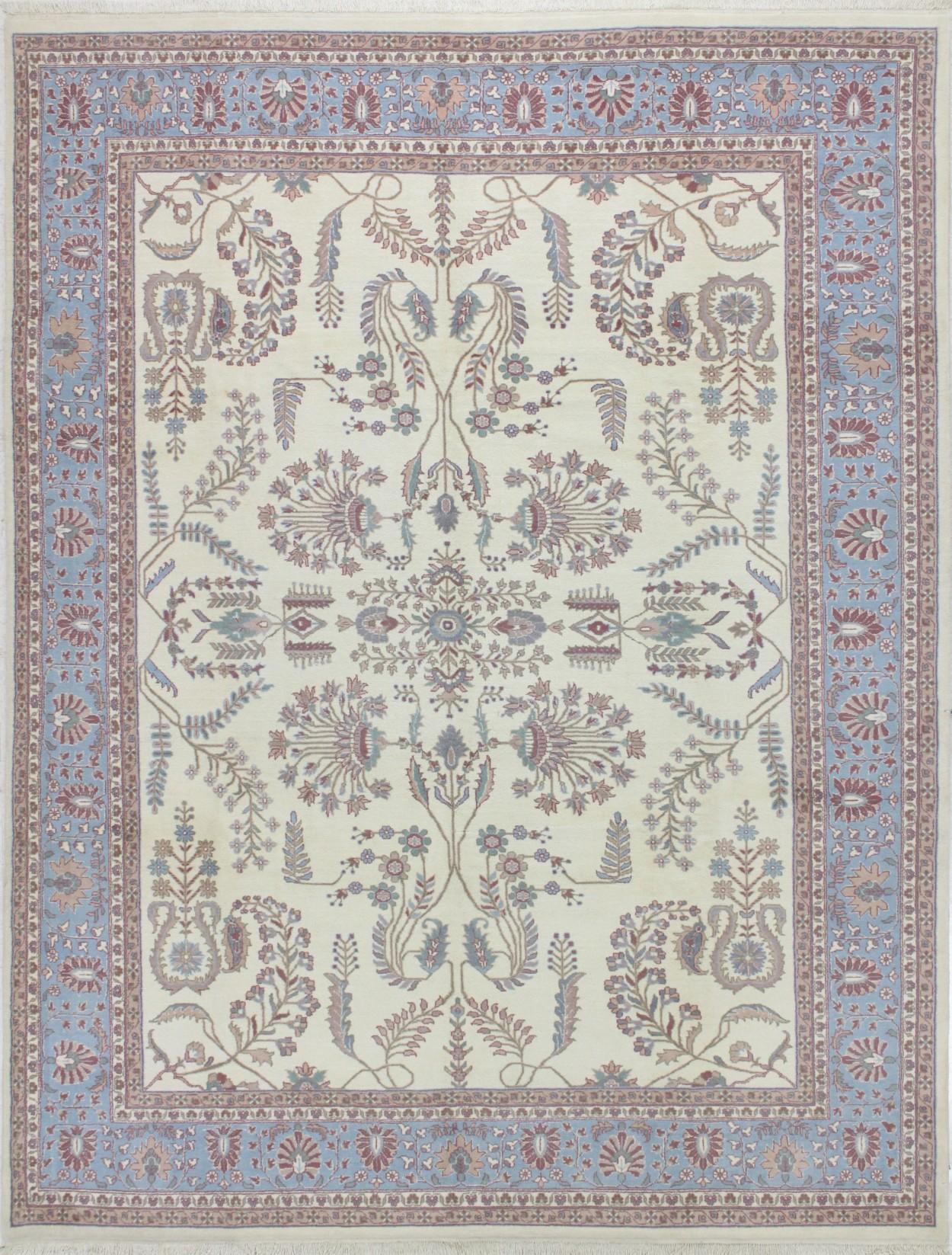 12’1” x 9’4” Sarouk 904 – 23284 Rug#:23284Size:9’4” x 12’1”Design: SaroukDesign#: 904Field Color: IvoryBorder Color:Light BlueContent:100% Wool PileOrigin: IndiaSize Category:9 x 12 rugs category Traditional Collection date June 23, 2023