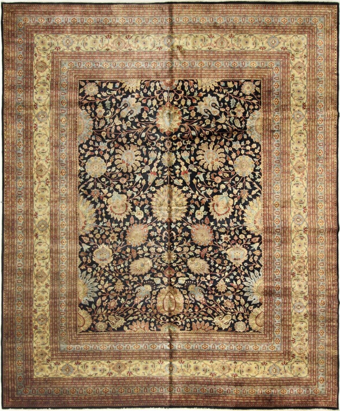 15′ x 12’4” Agra F-38 – 114990 Rug#:114990Size:12’4” x 15′Design: AgraDesign#:F-38Color: Black / GoldContent:100% Wool PileOrigin: IndiaSize Category:12×15 category Traditional Collection date October 27, 2022