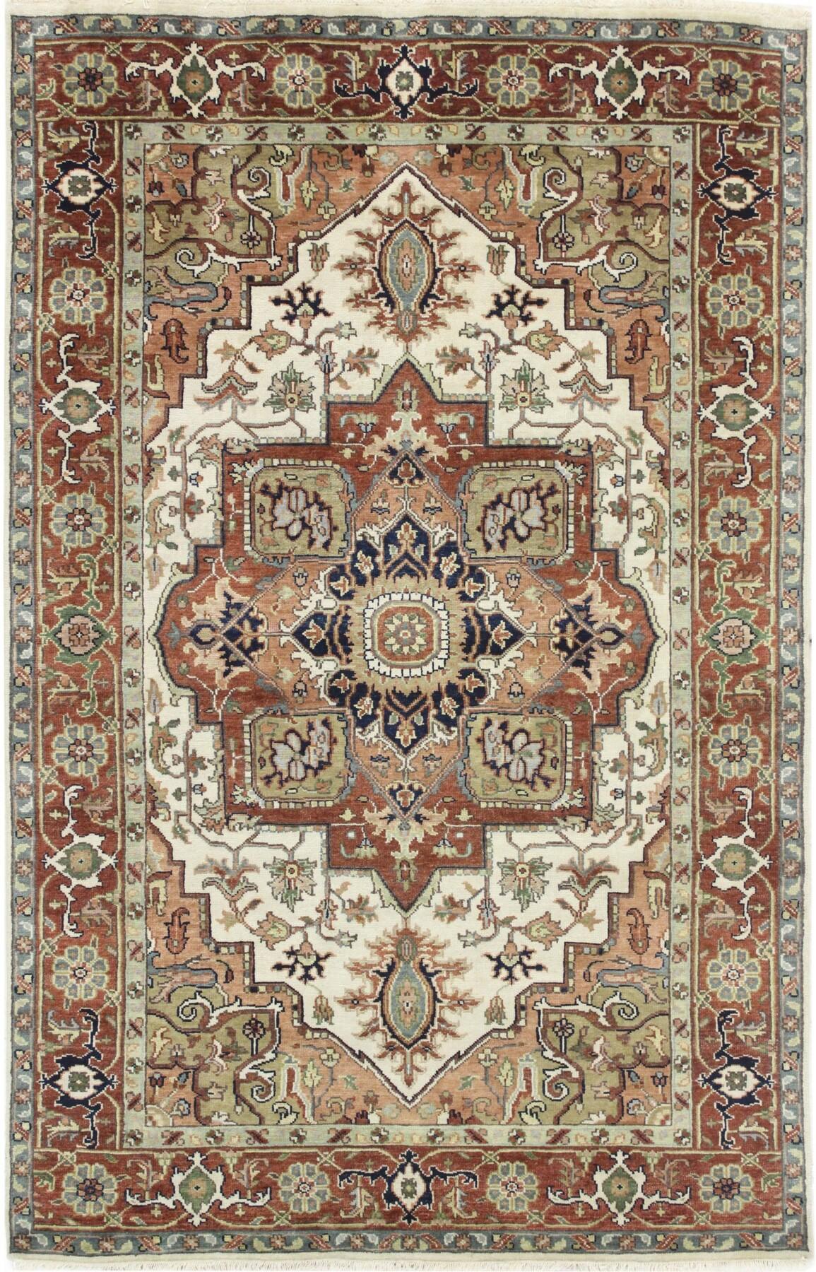 8’10” x 5’8” Heriz 101 – 122979 Rug#:122979Size:5’8” x 8’10”Design: HerizDesign#:101Color:Ivory / RustContent:100% Wool PileOrigin: IndiaSize Category:6×9 category Traditional Collection date November 3, 2022
