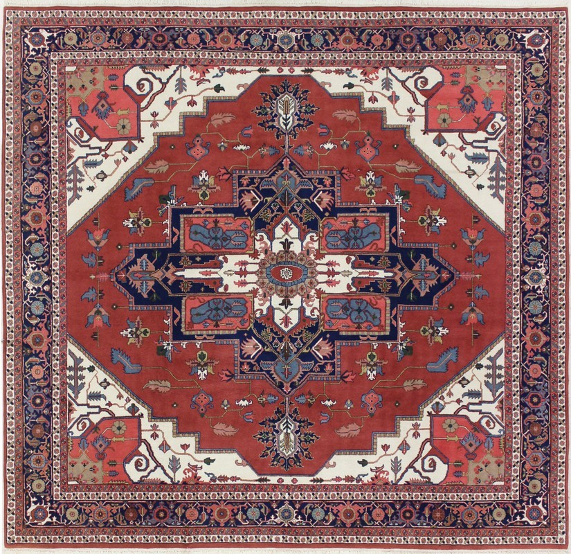 9’4” x 8’11” Heriz 1011 – 25622 Rug#:25622Size:8’11” x 9’4”Design: HerizDesign#: 1011Color: Red / NavyContent:100% Wool PileOrigin: IndiaSize Category:9×9 square category Traditional Collection date January 17, 2023